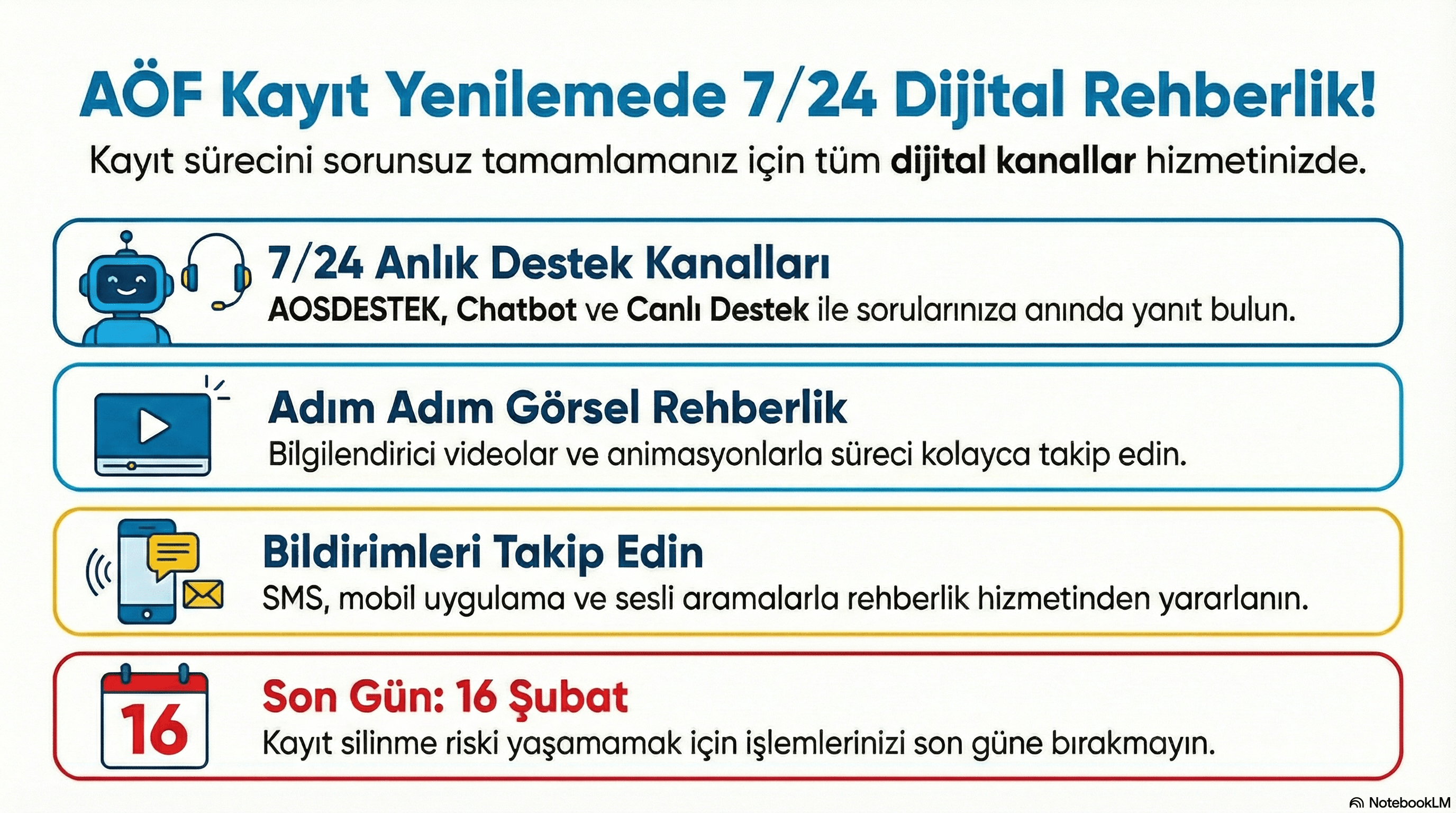 Kayıt yenileme sürecinin sorunsuz bir şekilde tamamlanması amacıyla öğrenciler, işlemlerini gerçekleştirirken takıldıkları her noktada; sesli yanıt sistemi, canlı destek hizmeti sunan çağrı merkezi, soru-cevap platformu AOSDESTEK ve yapay zekâ tabanlı sanal asistan Chatbot aracılığıyla anlık yardım alabiliyor. Sürecin daha şeffaf ve anlaşılır olması için hazırlanan bilgilendirici video ve animasyonlar da fakültenin resmi kanallarında yayına alındı. Ayrıca üniversite; SMS, mobil uygulama bildirimleri ve sesli aramalarla öğrencilere adım adım rehberlik ederek kayıt sürecini kolaylaştırmayı hedefliyor.