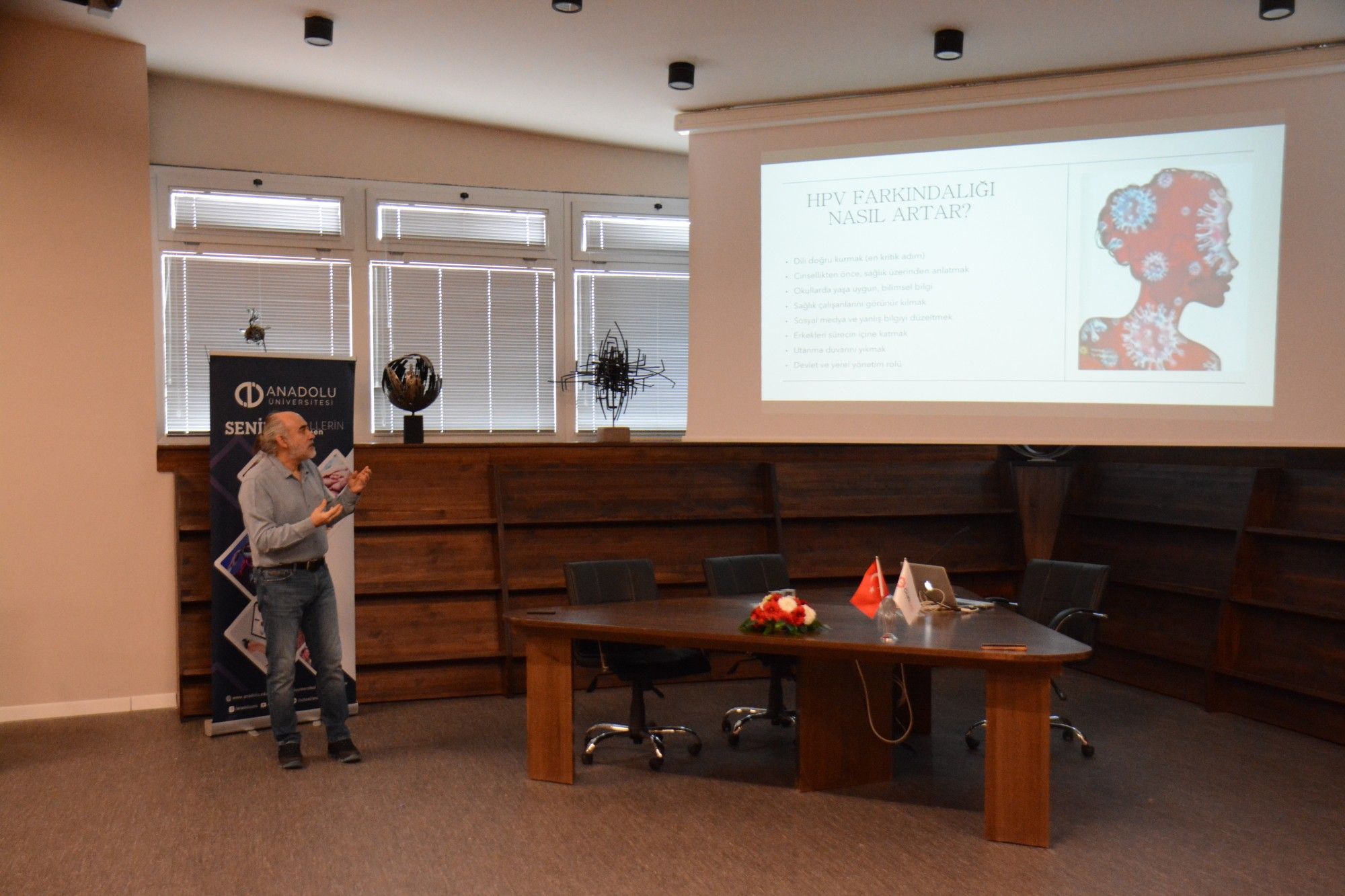 Anadolu Üniversitesi Kadın ve Aile Çalışmaları Uygulama ve Araştırma Merkezi Müdürlüğü tarafından düzenlenen “Rahim Ağzı Kanseriyle Mücadele ve Farkındalık Eğitimi”, İletişim Bilimleri Fakültesi Şener Şen Salonu’nda gerçekleştirildi. Eskişehir Özel Gürlife Hastanesi’nden Op. Dr. Ramazan Bayırlı’nın konuşmacı olarak katıldığı eğitime; Toplumsal Cinsiyet Eşitliği Komisyonu Akademik Temsilcisi ve İktisadi ve İdari Bilimler Fakültesi Siyaset Bilimi ve Kamu Yönetimi Bölümü Öğretim Üyesi Doç. Dr. Duru Şayhar Akdemir, Toplumsal Cinsiyet Eşitliği Komisyonu Akademik Temsilcisi ve Eğitim Fakültesi Türkçe ve Sosyal Bilimler Eğitimi Bölümü Öğretim Üyesi Doç. Dr. Elvan Günel, Toplumsal Cinsiyet Eşitliği Komisyonu Akademik Temsilcisi ve İİBF Kamu Yönetimi Bölümü Öğretim Üyesi Doç. Dr. Ayşen Seymen Çakar ile çok sayıda katılımcı katıldı.