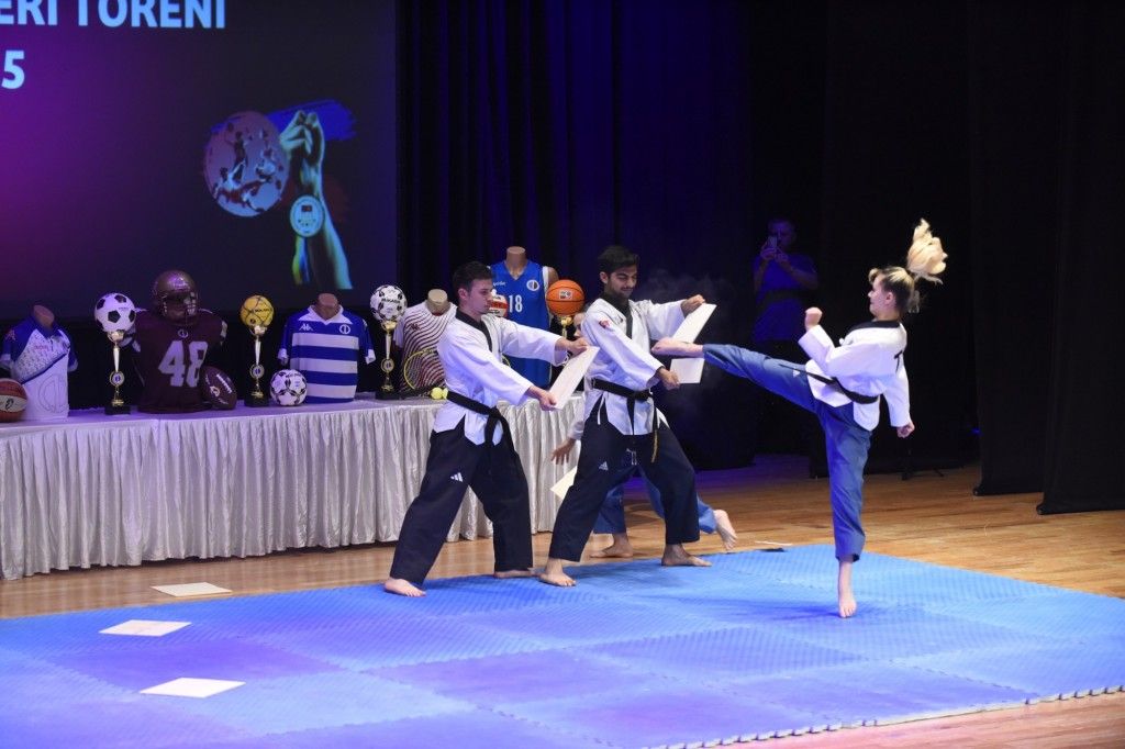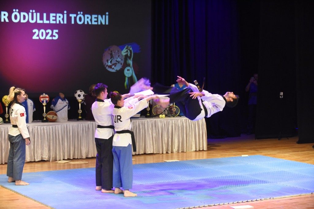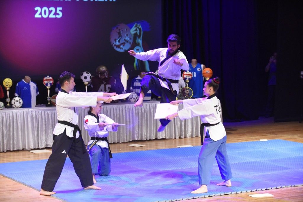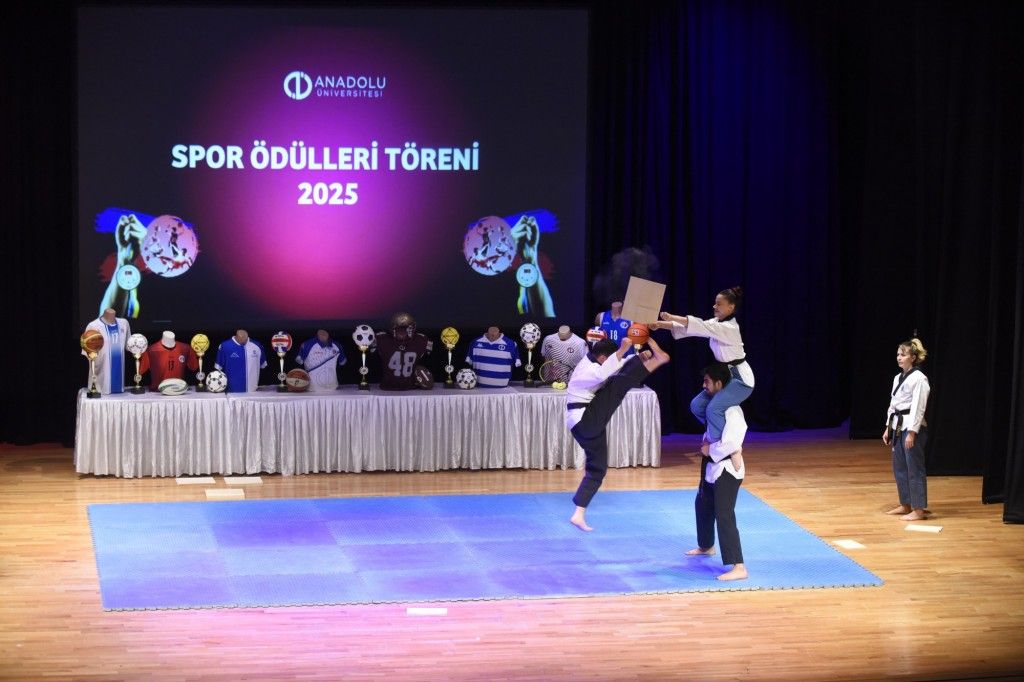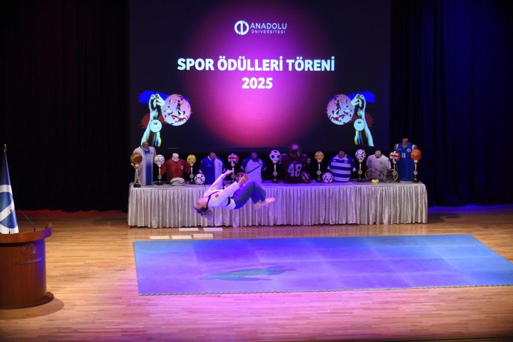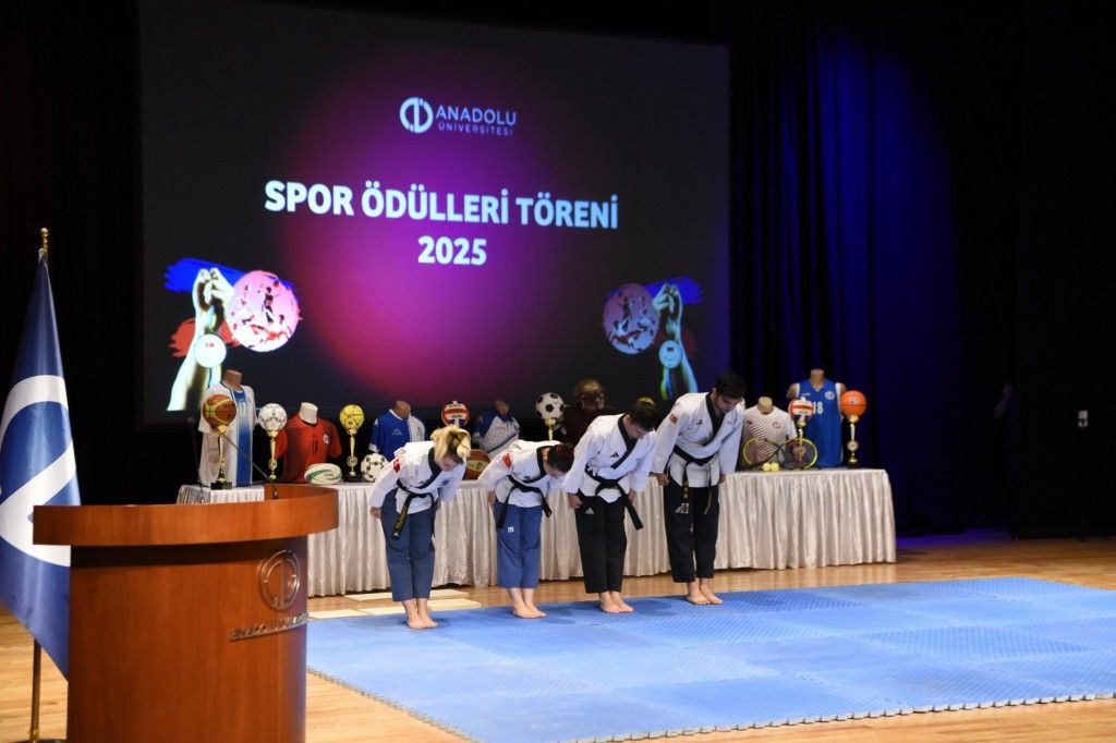 Açılış konuşmaları öncesinde Spor Ödülleri 2025 Töreni, TÜSF Tekvando Branşında Anadolu Üniversitesini temsil eden aynı zamanda 4 kez dünya ikincisi, 3 kez dünya üçüncülüğü, 6 kez Avrupa Şampiyonluğu, 2 kez Avrupa ikinciliği, 4 kez Avrupa üçüncülüğü, 32 kez Uluslararası şampiyonluğu, 19 kez Türkiye Şampiyonluğu başarılarını kazanan öğrencimiz Gülsena Karakuyulu Ertunç ve yine Avrupa dereceleri olan Ömer Doğukan Öztürk ve Büşra Özden’in gösterileri ile başladı.