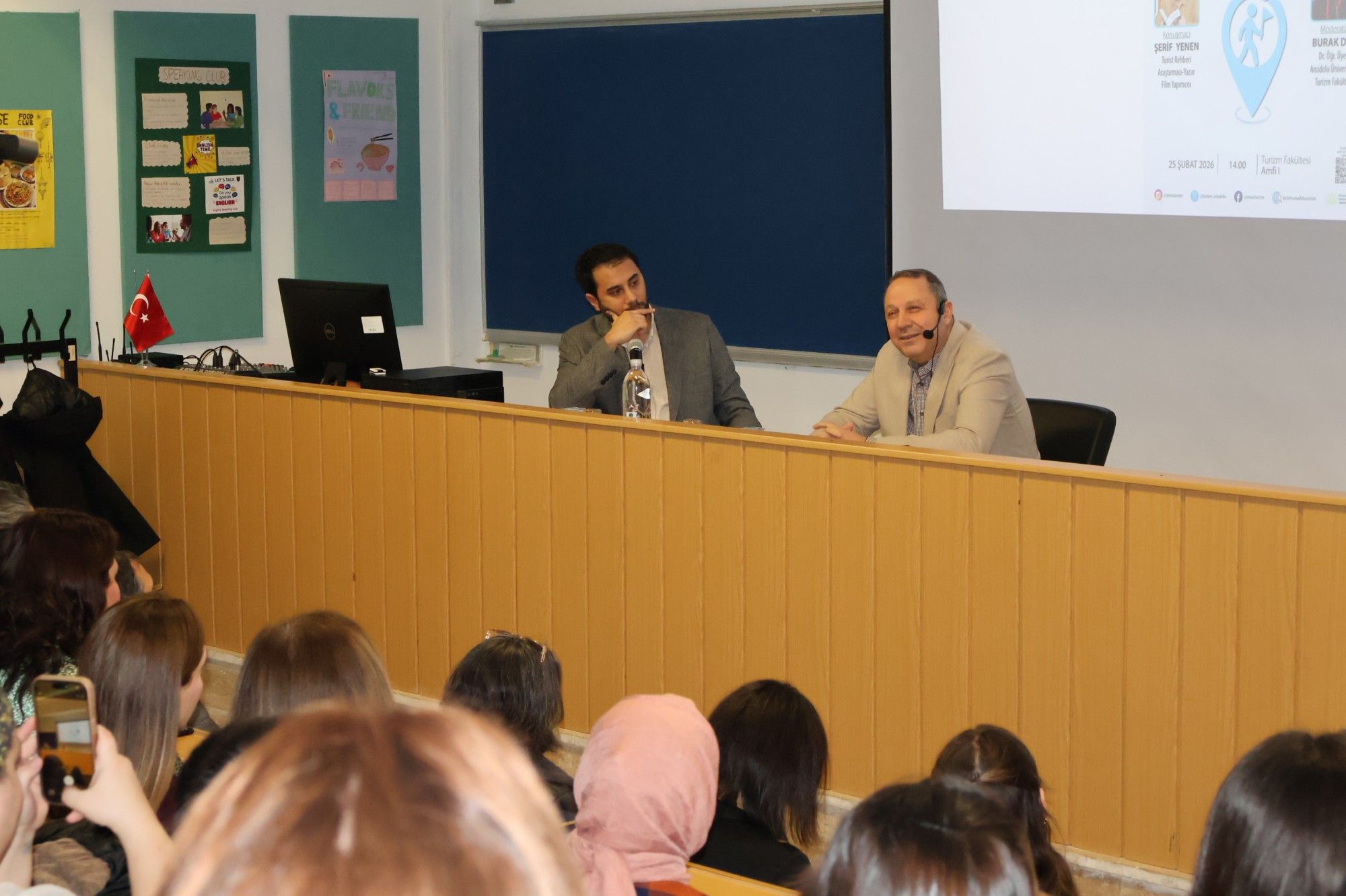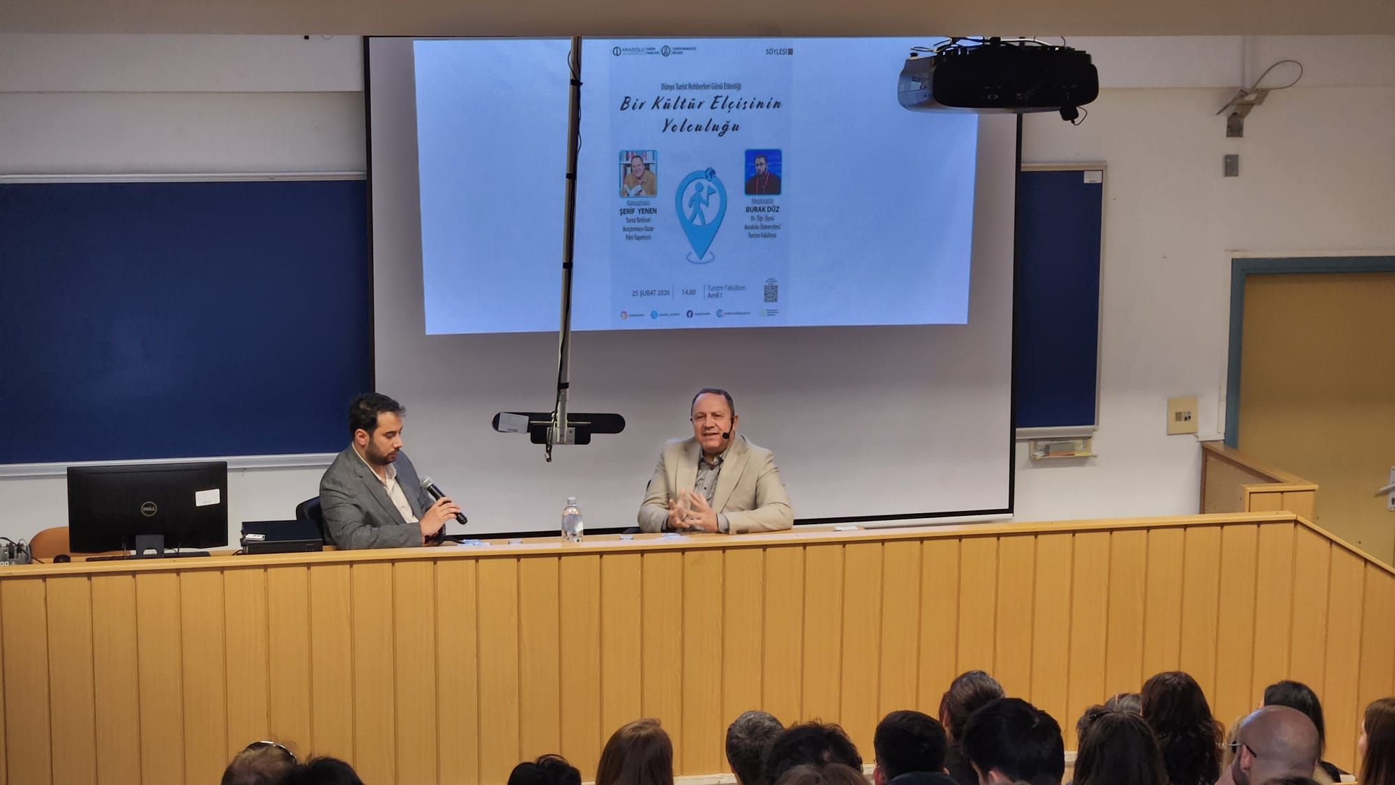 Anadolu Üniversitesi Turizm Fakültesi Turizm Rehberliği Bölümü tarafından, Dünya Turist Rehberleri Günü kapsamında anlamlı bir etkinlik düzenlendi. Turist rehberliği alanının duayen isimlerinden araştırmacı-yazar, turist rehberi ve film yapımcısı Şerif Yenen, öğrenciler ve meslektaşlarıyla söyleşi programında bir araya geldi. Turizm Fakültesi Dr. Öğr. Üyesi Burak Düz’ün moderatörlüğünde gerçekleştirilen etkinlik; Turizm Rehberliği Bölümü öğrencileri ile Eskişehir Turist Rehberleri Derneği (ESRED) üyelerinin yoğun katılımıyla düzenlendi.