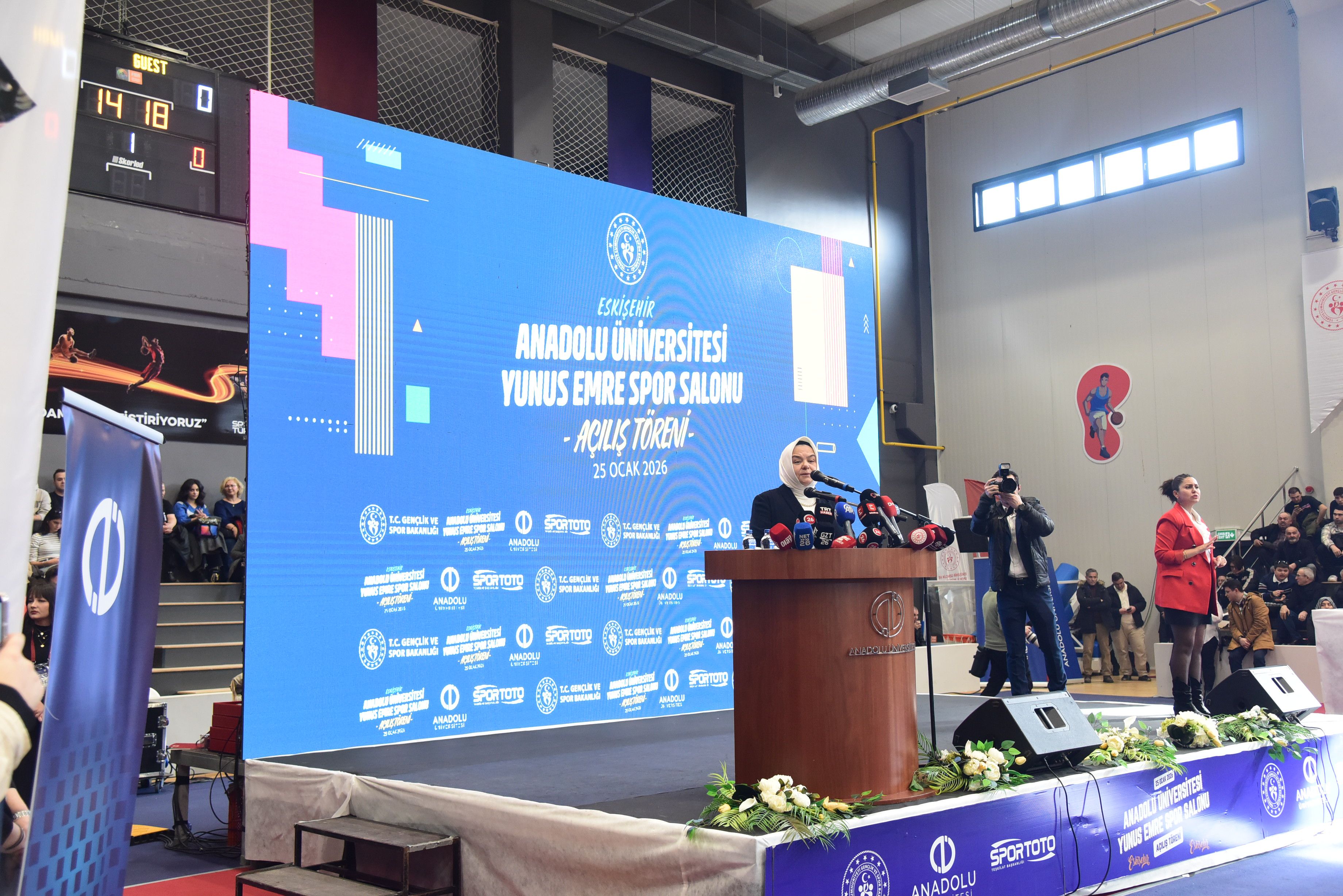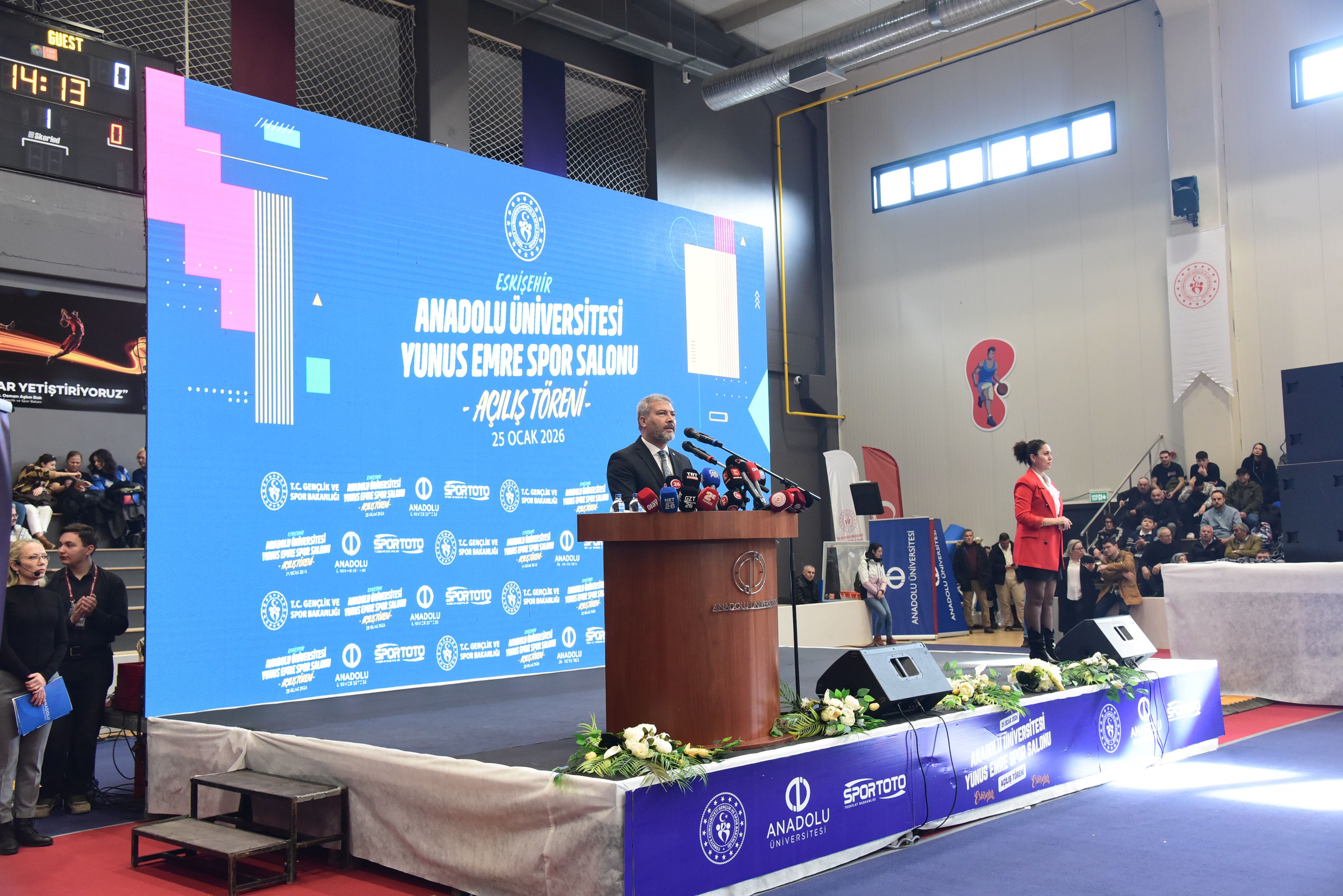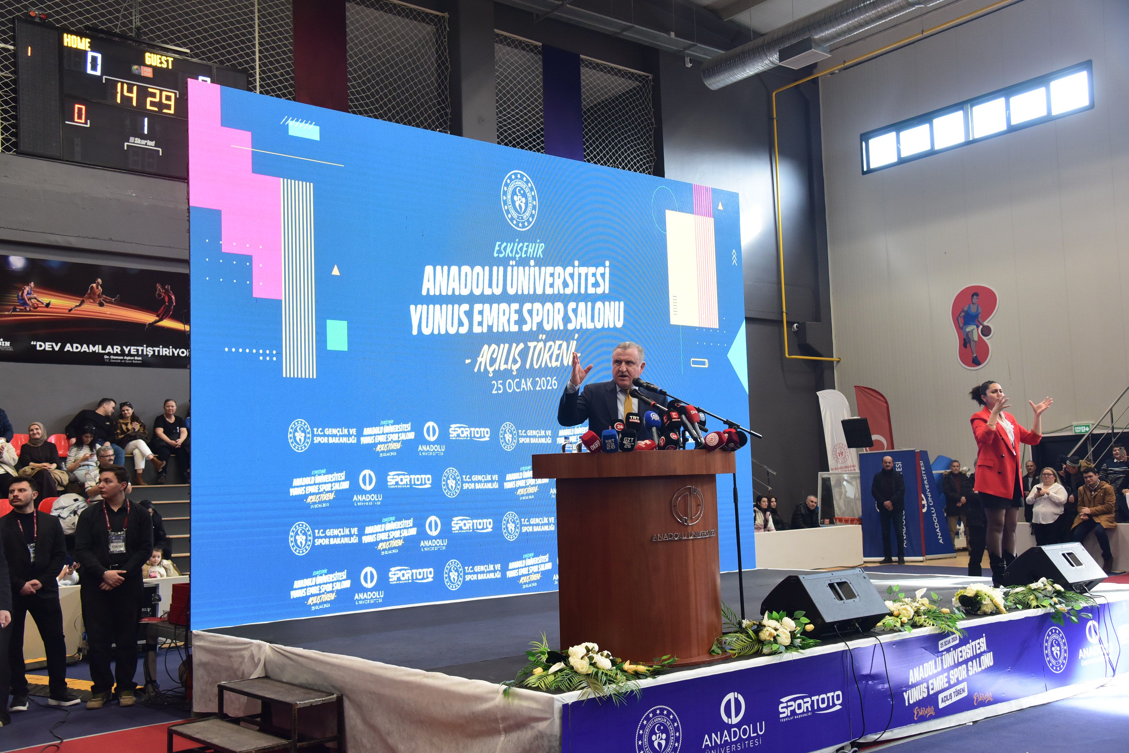 T.C. Gençli ve Spor Bakanı Dr. Osman Aşkın Bak, Yunus Emre Kapalı Spor Salonu açılış töreninde şunları söyledi: “Modern ve UEFA–FIFA standartlarına uygun 40’a yakın stadyum, kapalı spor salonu ve yüzme havuzuyla Türkiye genelinde büyük bir spor tesisi yatırımı gerçekleştirildi. Bugün bu yatırımlardan birine de Anadolu Üniversitesi ile birlikte destek verdik. Böylesine özel bir şehirde, Eskişehir’e, üniversitemize ve sizlere yakışır nitelikte bir spor salonunu kazandırmış olmaktan mutluluk duyuyoruz. Tesisin Anadolu Üniversitesi öğrencilerine ve Eskişehirli genç sporculara hayırlı olmasını temenni ediyorum. Üniversiteler sporun yuvası olmalıdır. Biz de bu anlayışla Spor Dostu Kampüs Projesi’ni hayata geçirdik. Projelerimizle üniversitelerde sporun yaygınlaşmasını ve gençlerin daha güçlü bir altyapı içerisinde spor yapmasını hedefliyoruz. Çocuklara sporu sevdirmek ve öğretmek son derece kıymetlidir. Spor birleştirir, iyileştirir ve toplumsal dayanışmayı artırır. Bu nedenle herkesi spor yapmaya ve milli takımlarımıza destek olmaya davet ediyoruz. Bizler, sporu seven, sporla büyüyen, sağlıklı ve ahlaklı bir gençlik istiyoruz.”