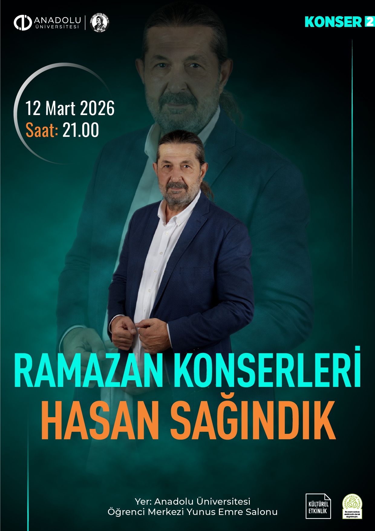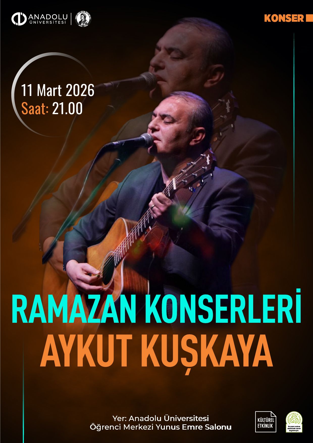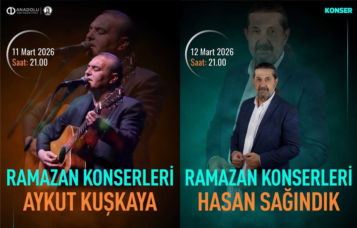 Etkinlikler kapsamında, 11 Mart Çarşamba günü saat 21.00’de sanatçı Aykut Kuşkaya, 12 Mart Perşembe günü saat 21.00’de ise sanatçı Hasan Sağındık sahne alacak. Konserler, Anadolu Üniversitesi Öğrenci Merkezi Yunus Emre Salonu’nda gerçekleştirilecek.